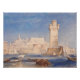 Rodas. Joseph Mallord William Turner (1775 - 1851). Un bonito paisaje marino en tonos rosa y azul. En primer plano hay barcos y barcos en la bahía, cerca de las murallas de la ciudad. en el centro, hay una torre alta. Al fondo, una ciudad con casas de piedra. Reproducción de obras famosas de imágenes artísticas de dominio público.