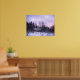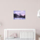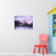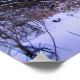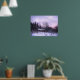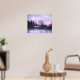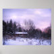 Este poster cuenta con una puesta de sol en invierno. Una casa roja está escondida en los árboles con luces brillantes en el interior. La nieve blanca pura se ha apilado en el campo. Las nubes del cielo brillan con colores arcoiris de naranja, rosa, amarillo, azul y violeta.