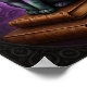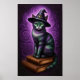 Este caprichoso poster cuenta con un gato enmascarado de brujas sentado sobre dos libros apilados en un vibrante fondo violeta.