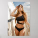 A woman in a stylish black bikini poses confidently on a yacht under a clear sky. The sun casts a warm glow, highlighting her relaxed demeanor.