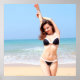 A swimsuit model in a black and white bikini poses with her arms raised on a sunny beach. The ocean waves and clear sky create a vibrant backdrop.