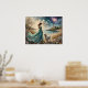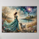 Póster Woman in blue gown on beach with dog, lighthouse.