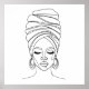 An elegant line art portrait featuring a woman with closed eyes wearing a beautifully wrapped head scarf and statement hoop earrings. This minimalist illustration captures grace and tranquility through continuous flowing lines.