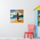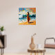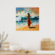 An oceanic themed poster. A beautiful ai illustration done in an oil painting impasto style. A woman walking on the beach with an abstract mosaic vibrant colorful style.