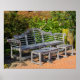 A wooden bench is nestled amidst vibrant greenery and blooming flowers. The scene is tranquil and inviting, showcasing a charming blend of brick and natural textures.