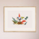 Ilustracion temática verde y rojo de los bosques diseñado por Shelby Allison con un pequeño personaje gnomo, hongos, flores y follaje.
