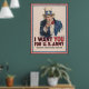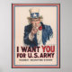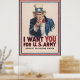 El poster de guerra con la famosa frase "Te quiero por el ejército de EE.UU." muestra al tío Sam señalando su dedo al espectador para reclutar soldados para el ejército estadounidense durante la Primera Guerra Mundial. La frase impresa "estación de reclutamiento más cercana" tiene un espacio en blanco a continuación para añadir la dirección de inscripción.