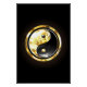 Joyería, oro y símbolo yin yang negro sobre fondo negro. Oro yin yang.