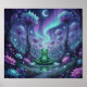 This fantasy poster features a Meditating frog on a lily pad in a glowing, purple-hued magical forest under an aurora and crescent moon-serene fantasy art with luminous flowers.