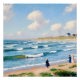 Dit schilderij toont een idyllische zomerse dag aan de kust, waar twee mensen ontspannen genieten van een picknick op het strand. De rustige golven rollen zachtjes aan land onder een heldere blauwe lucht, bezaaid met donzige witte wolken. In de verte zijn charmante huisjes zichtbaar, die het gevoel van rust en sereniteit versterken. De subtiele details en warme kleuren creëren een nostalgische sfeer, perfect voor wie verlangt naar eenvoudige, zorgeloze zomerdagen aan zee.