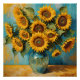 Dit schilderij toont een levendig boeket zonnebloemen tegen een kleurrijke, impressionistische achtergrond. De zonnebloemen, met hun heldergele bloemblaadjes en groene bladeren, stralen warmte en energie uit. De blauwe achtergrond vormt een mooi contrast met de warme kleuren van de bloemen, waardoor het geheel een harmonieuze en levendige compositie vormt.