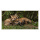 Dos zorritos rojos están retratados abrazándose en la sombra de árboles de hoja perenne.