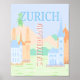 Este diseño es un encantador ilustracion de tonos pastel inspirado en Zúrich, Suiza. La composición tiene un fondo suave, azul y verde que evoca la serenidad y belleza escénica de los Alpes suizos, retratados con siluetas de montaña. Destacados elementos arquitectónicos, como las emblemáticas torres de iglesia de Zúrich, están estilizados en tonos azules pastel y naranjas, lo que le da al ilustracion un aire caprichoso.