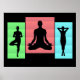 Tres poses de yoga sobre el cielo rosado y los fondos de efecto ciego gradiente de color menta.
