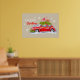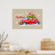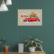 Posters para Feliz Navidad, con un lindo ilustracion de un auto decorado festivamente con ramas de abeto y cajas con regalos en el techo.