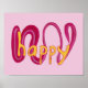 La palabra "feliz" está pintada de amarillo y recortada en magenta. Se exhibe frente a un diseño de remolinos de magenta rosa, sobre un fondo rosa. Puede personalizar del color de fondo con el color que desee. He encontrado que las afirmaciones positivas son útiles; ¿pueden considerarlas útiles también?