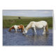 Serie salvaje del potro: Dos potros de Dartmoor, casi hasta sus vinos del Rin, están bebiendo en un agujero de riego, muy lleno de la lluvia reciente. Uno es picazo y uno es blanco. Un potro marrón está pastando en la hierba áspera de la paramera en la distancia cercana.