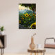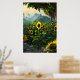 Piso de girasoles con un bosque con cielo despejado y el sol en el fondo. Este es un arte generado por IA.