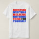 Pregunta todo camiseta: No crea nada, piense para sí mismo. El individualismo poco fiable cínico escéptico en él es el mejor. Confianza divertida nadie elección presidencial Barack Obama de la parodia de la parodia de la derecha de la sátira de la libertad del chiste de la autoridad gubernamental del humor de la fiesta del té del republicano radical de Mitt Romney de los republicanos del senado del presidente conservador anti egoísta cínico del congreso