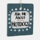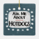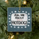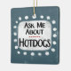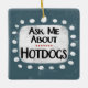 "Pregúntame sobre los Hotdogs" es un diseño tipográfico humoralmente lindo con acentos de puntos sobre un fondo sólido.