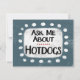 "Pregúntame sobre los Hotdogs" es un diseño tipográfico humoralmente lindo con acentos de puntos sobre un fondo sólido.