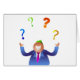 Ilustracion de un hombre feliz con un traje malabarizando símbolos de signos de interrogación. Tal vez esté ahí para responder a todas tus preguntas y resolver tus problemas. Eso sería bueno. Imagen disponible en varios regalos y productos.