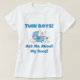 A la orgullosa nueva madre y padre de los bebés mellizos les encantará este lindo diseño que incluye dos conejitos de niños y texto azul que dice "¡Niños gemelos! ¡Pregúntame Por Mis Hijos!" Camisetas gemelas, tarjetas, botones, imanes, bolsas, ratones y otros!