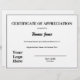 Se trata de un modelo para un certificado de apreciación. Tiene texto que puede editar para mostrar el nombre del destinatario en un guión elegante. También puede editar el otro texto para personalizar del premio para su ocasión y organización. Hay una línea para que la persona que da el premio firme. También puede imprimir el nombre y el título de esa persona bajo la línea. Una imagen para mostrar está cerca de la parte inferior que puede reemplazar con el logotipo de su organización. El papel es blanco. El texto es negro.