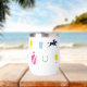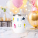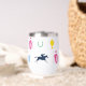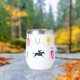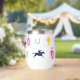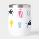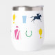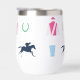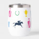 Perfecto para un día en las carreras, este aislado vaso de vino presenta un patrón de siluetas icónicas de carreras de caballos: seda de jockey, silueta de caballo de carreras, zapato de caballo, taza de julep y trofeo de caballo. El patrón está en una paleta de colores vibrante.