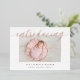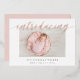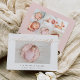 Los modernos y elegantes anuncios de nacimiento presentan tu foto favorita horizontal o paisajista orientada al neonato con "presentando" a través de la parte superior en letras de guiones de caligrafía de Relieve metalizado de oro rosa. El nombre del bebé y las estadísticas de nacimiento aparecen debajo. Agregue seis fotos adicionales a la parte posterior en un diseño de collage o elimine para dejar en blanco.
