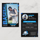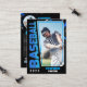 ¡Crea una tarjeta de béisbol personalizada y única para celebrar a tu jugador favorito! Este diseño moderno cuenta con un esquema de color negro y azul, un marco de foto impactante y un espacio para todas las estadísticas importantes.