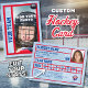 Sea igual que los profesionales al tener su propia tarjeta de hockey personalizado con una foto de usted mismo en la parte delantera y sus estadísticas personales de hockey en la parte trasera. Obtendrás muchas tarjetas en un paquete porque estas tarjetas están destinadas a comerciar con amigos y también a dar a parientes. ¡Pon a tu pequeño jugador de liga en una tarjeta hoy! Tanto la parte delantera como la trasera de la tarjeta de hockey tienen una superficie de hielo marcada con patines como fondo con bordes de línea roja.