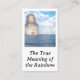 El diseño frontal muestra la hermosa imagen del Sagrado Corazón de Jesús en un borde oval sobre un arco iris sobre las aguas. Las palabras "El verdadero significado del arcoiris" se muestran debajo de la imagen. Al revés aparecen las palabras de Nuestro Señor en el significado del arco iris como Su pacto con el mundo. Dios prometió que el arco iris es la señal de Su promesa de que nunca más destruirá toda la tierra con una inundación. El arcoiris no tiene NADA que ver con el pecado. Nunca hay tiempo para estar orgullosos de nuestros pecados. Todo lo que va en contra de la voluntad de Dios es pecador. Por lo tanto, recuperemos el arco iris y promovamos su verdadero significado, establecido por Dios. ¡Usa estas tarjetas para ayudar a difundir su promesa!