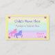 Los colores en colores pastel bonitos hacen esto una selección deliciosa para una tarjeta de visita de los niños. Un unicornio rosado y azul con los cuernos de oro adorna el fondo en colores pastel de la pendiente, y el rosa que mira los remaches del botón está en cada esquina. Modifique todos los campos del texto para requisitos particulares con su información personal e incluso cambie cuántos o pocos campos del texto usted tiene. Cambie el texto y los colores del marco de tarjetas también si usted tiene gusto. No olvide que hay a de nuevo a la tarjeta también.
