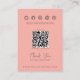 Tarjeta de visualización de joyas QR social de hoja rosa de coral: cree una representación armoniosa de marca con estas tarjetas de visualización de joyería con un diseño botánico rosa pastel de coral. Su sofisticado atractivo los convierte en una excelente elección para las boutiques de moda que atienden a las clientes femeninas. Su emblema comercial ocupa un lugar destacado en la parte superior de la tarjeta. Personalizar la colocación de pendientes y collares utilizando círculos designados. Un sutil contorno naranja de hojas botánicas adorna el frente de la tarjeta, añadiendo un toque elegante. Girar la tarjeta para revelar tu presencia en línea (información de medios sociales/sitios web) a través de un código QR, fomentando el compromiso con los clientes. Concluye con una nota de agradecimiento personalizada o un eslogan único en la parte inferior. Personalizar la exhibición de íconos de medios sociales a tu gusto. Explore nuestro surtido coordinado para una solución completa de marca.