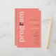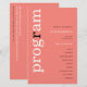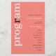 Programa de Matrimonio de Texto Rosado Rosa de Coral Simple. Un precio económico de 5,5" x 8,5", en una elegante stock de 110 lb LINEN - para un ambiente de lujo a gran valor, es perfecto para menús, así como invitaciones y programas, etc. Esta alternativa de tamaño de presupuesto también está disponible en otras opciones de papel. El material de la tarjeta SEMI-GLOSS de 110 lb es aproximadamente del mismo grosor que una postal, por lo que también funciona bien para las invitaciones. El papel FELT de 100 libras es de color buff, NO blanco, por lo que añade un toque rústico. El material de papel MATTE 80lb es blanco brillante, para impresión crujiente, excelente para sus menús y programas, mientras que el papel SATIN 80lb es delgado y ligero Un diseño tipográfico moderno con el programa en tipografía grande en blanco con la "r" en negro, rotado y a la izquierda en un fondo de rosa rosa de coral.