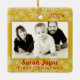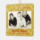 Foto del bebé antes del adorno de Navidad. Ornamento de árbol cuadrado de dos lados en amarillo dorado con texto rojo. La plantilla fotográfica es horizontal con un borde dorado. Fecha del año en la parte superior, con nombre y texto de "primera Navidad" debajo de la foto. En la parte posterior se puede agregar más texto. Un ejemplo podría ser el domicilio donde el niño vivió por primera vez, o decir "Feliz Navidad" para que sea un regalo adorno a los abuelos o parientes.
