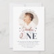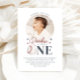 Celebra el primer cumpleaños de tu pequeña con el tema del béisbol con este diseño que incluye tu propia foto y "Nuestro pequeño novato está girando uno" a su alrededor, junto con un ilustracion acuarela de un béisbol como el O en ONE.