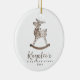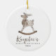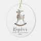 Ornamento cerámico de primera Navidad de Toy Reindeer Baby — La preciosa plantilla personalizada de adorno de navidad incluye un adorable caballo de canapé de juguete de color agua. Los cuadros de texto permiten una fácil personalización del nombre de cualquier bebé en un tipo de letra manuscrita de caligrafía, y el año de nacimiento en un sans serif simple y minimalista. Ambos lados de esta decoración de árbol de keepsake personalizable y neutro en género son idénticos.