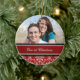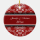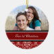 1r personalizable del ornamento de la foto del navidad de los pares con su propia foto, nombres y fecha en el rojo elegante, modelo floral clásico blanco y negro del damasco. Una manera elegante de adornar su árbol de navidad u hogar para los días de fiesta. La de manera perfecta de recordar su primer navidad junto como par.