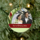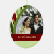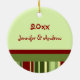 1r personalizable del ornamento de la foto del navidad de los pares con su propia foto, nombres y fecha en modelo rojo, amarillo y verde festivo de las rayas. Una manera elegante de adornar su árbol de navidad u hogar para los días de fiesta. La de manera perfecta de recordar su primer navidad junto como par.