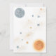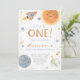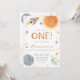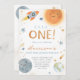 La invitación incluye diseño espacial, sol, luna, cohete, estrellas y planeta tierra. Perfecto para un tema de primer cumpleaños.
