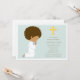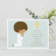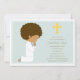 Del azul invitación de la comunión santa primero que ofrece un muchacho afroamericano de arrodillamiento en la cruz izquierda, amarilla con la comunión o a los detalles del fiesta en la derecha en marrón.
