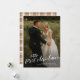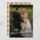 Una simple tarjeta de festividad fotográfica con primera navidad escrita a mano y rama y tipo mínimo. Haga clic en el botón de edición para personalizar de este diseño.
