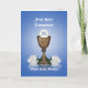 Imagen y composición de ilustracion del cáliz dorado sobre azul con rosas blancas y texto para la invitación de la primera fiesta de la Santa Comunión del niño