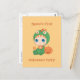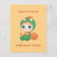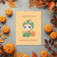 Bebé adorable vestido con un traje de dragón verde con pinchos naranjas y una bestia naranja con cráneo. Una calabaza curvada está un poco atrás. La primera invitación del bebé a la fiesta de Halloween, cualquier género.