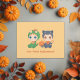 Bebés adorables con disfraces de Halloween. El de la izquierda está vestido como un dragón verde con picos naranjas. El de la derecha está usando un traje de gato negro con una gran proa naranja. Una calabaza curvada se sienta entre ellos y un poco atrás. Primera invitación a la fiesta de Halloween para los mellizos, cualquier género.