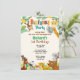 Estas encantadoras invitaciones son para anunciar su pequeño gran día. Rodeado de hojas y en los bordes superiores y divertidos animales lindos en la parte inferior. Los detalles de su evento especial se mostrarán en el centro.