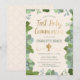 Esta invitación moderna y del bonito primero de la comunión santa ofrece un floral ilustrada y el verdor confina y las palabras "primera comunión santa" en el oro (efecto metalizado simulado). El fondo es un color crema, pero se puede modificar para requisitos particulares a cualquier color que usted elija. La parte posterior de la invitación incluye un modelo del quatrefoil del oro con un fondo poner crema a juego que se pueda también intercambiar hacia fuera. El texto es adaptable para su acontecimiento religioso especial.