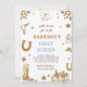 Celebra el día especial de tu pequeño vaquero con esta encantadora invitación de Primera Cabalgata. Perfecta para una fiesta de cumpleaños número uno con tema de rodeo, esta invitación presenta divertidos diseños inspirados en el oeste y elementos juguetones de vaquero que establecen el tono para una celebración memorable. Fácil de personalizar con el nombre de tu hijo, la fecha y los detalles de la fiesta, esta invitación es imprescindible para padres que planean un cumpleaños encantador con tema de vaquero. Ensilla y prepárate para un día lleno de diversión, amigos y emoción de rodeo.